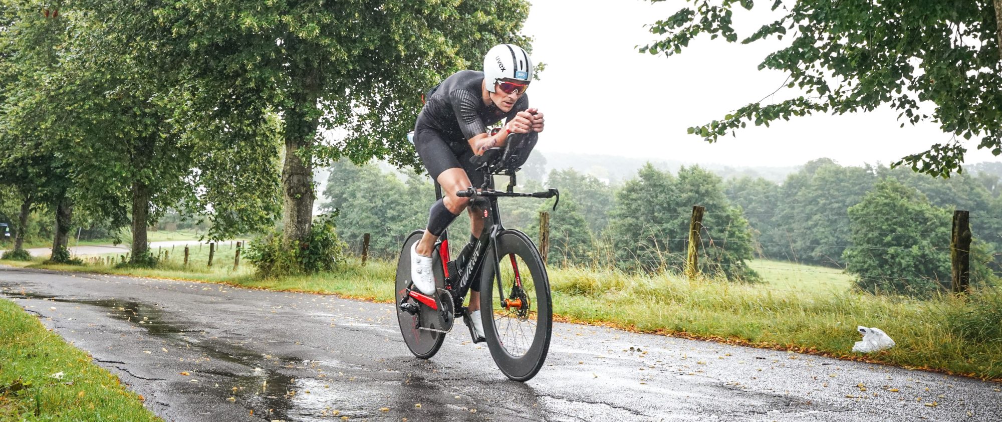 Optimal vorbereitet also, stand ich am Sonntag-Morgen an der Startlinie. Das Schwimmen lief nicht besonders gut, mir fehlte etwas der Wille die Komfortzone zu verlassen. Auch der erste Wechsel war bescheiden. Ich verlor mein Visier und musste einen kleinen Defekt am Radschuh-Verschluss beheben, bevor der Wettkampf für mich endlich richtig los ging. Ich kam gut voran, auch wenn sich die Beine noch nicht wieder ganz frisch anfühlten und ich etwas unter meinen anvisierten Wattwerten bleiben musste. Nach ca. 30 km konnte ich die große Verfolgergruppe ein- und direkt überholen, Nils Frommhold und Timothy O’Donnell waren ein Stück voraus. Zwei Athleten folgten mir im fairen Abstand, waren allerdings keine Hilfe um das Tempo hochzuhalten.