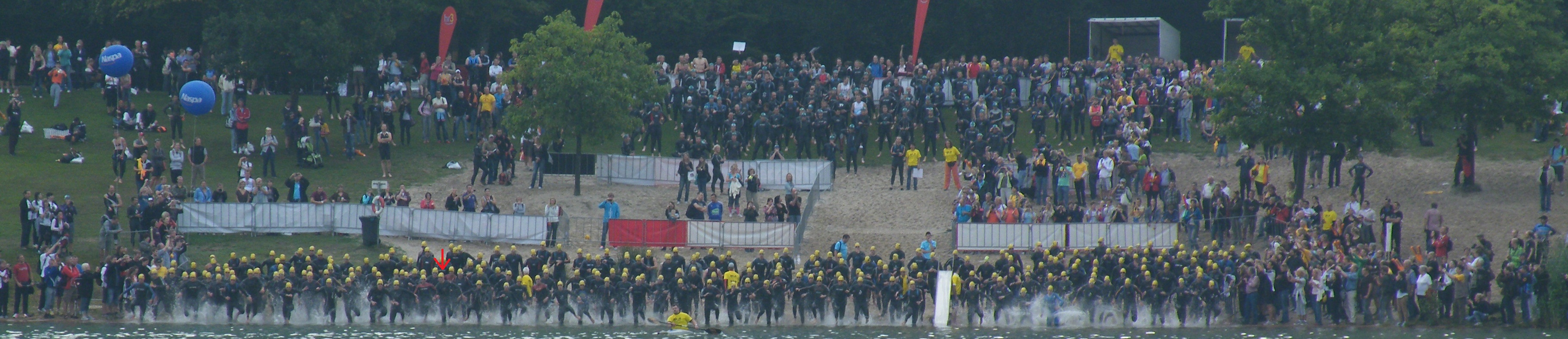 Sonntag, 4:30 Uhr klingelte dann der Wecker und ehe ich mich versah stand ich auch schon am Strand des Raunheimer Waldsees, zusammen mit ca. 250 anderen Starten meiner Startgruppe im Alter von 18 – 29 Jahren! 7:35 Uhr; STARTSCHUSS…