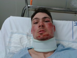 Am nächsten Morgen war dann alles etwas klarer. Ich bin irgendwie zu Fall gekommen (und das nicht mal auf einer Abfahrt) – mit Kopf und Gesicht vorweg gelandet, mein Helm opfert sich selbst und rettet mir dabei anscheinend das Leben. ich verliere das Bewusstsein und liege auf der Straße bis, wie es der Zufall will, MARCEL WÜST mit einer Radgruppe, vorbei kommt und sich sofort um mich kümmert. Ich komme kurz zu mir und kann ihm irgendwie die wichtigsten Infos über mich verklickern bevor ich gleich wieder weg trete.