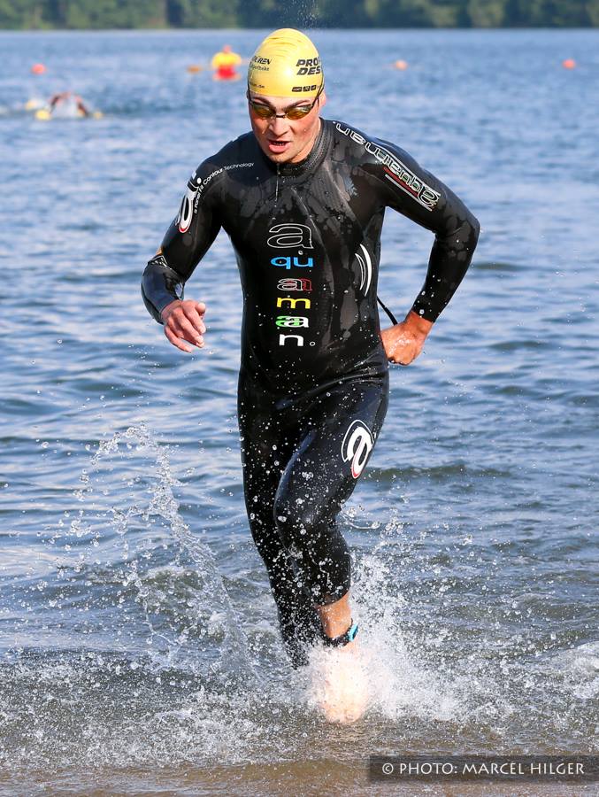 Pünktlich ging es um 8 Uhr bei 8°C Luft- und 18°C Wassertemperatur im glasklaren Sundhäuser See etwas außerhalb von Nordhausen los. Auf den zwei Schwimmrunden über die Gesamtdistanz von 1,9km habe ich mich zwar nicht sonderlich gut gefühlt und hatte kaum Wassergefühl, trotzdem war ich recht zügig unterwegs und konnte den Rückstand auf die Spitze mit reichlich einer Minute im machbaren Bereich. Mit einem zügigen Wechsel machte ich sofort zwei Plätze gut und ging als fünfter auf die Radstrecke.